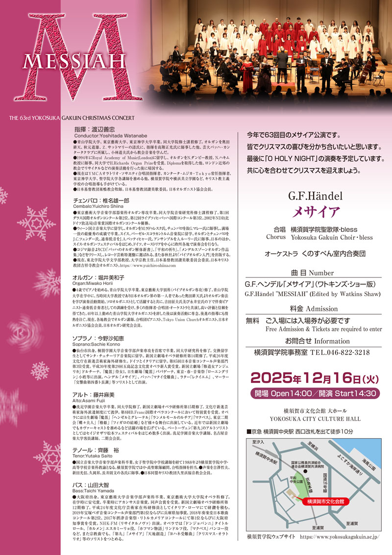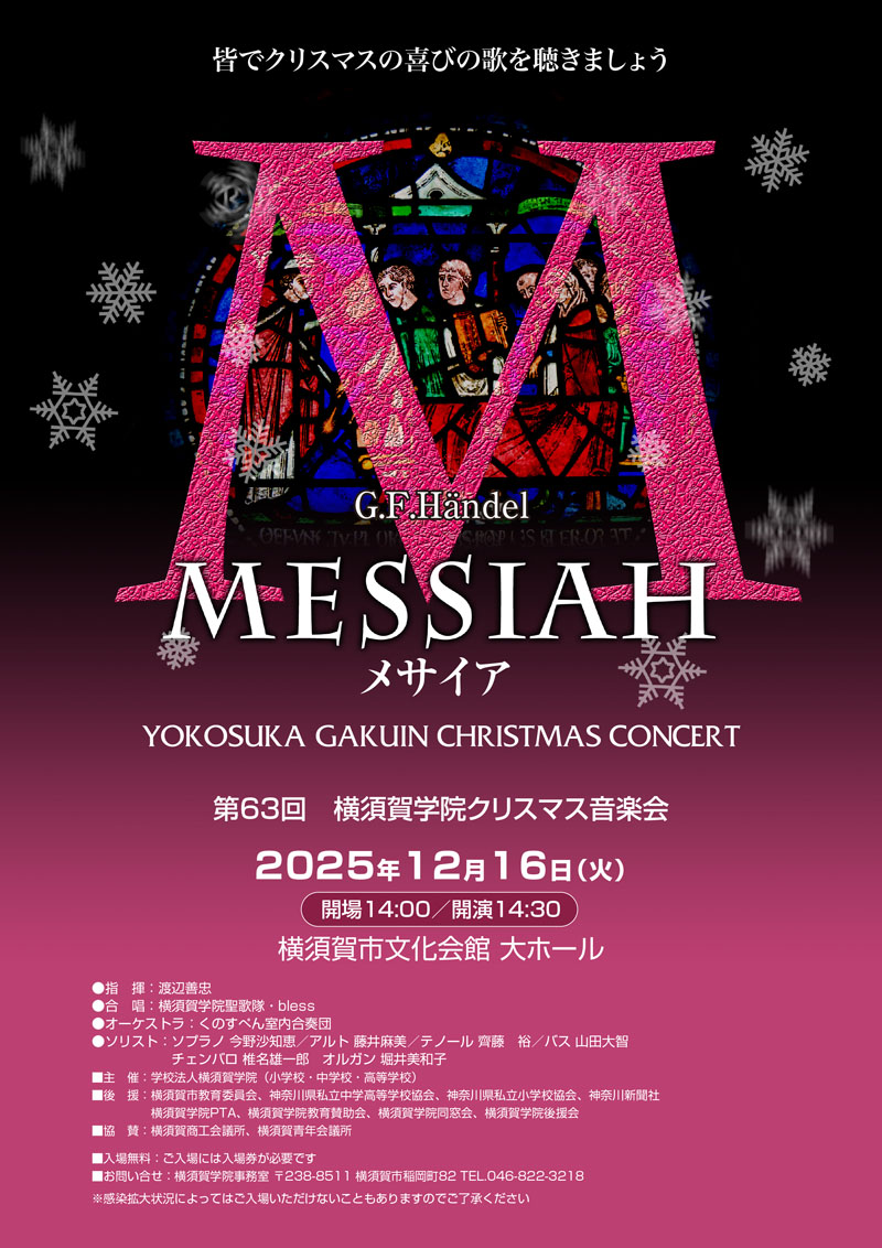 メサイア公演 12月16日(火)14時開場 14時30分開演 17時30分終演予定横須賀市文化会館大ホールにて 今年も昨年と同様座席数が激減しているため、入場券(無料)を本校事務窓口で配布し、入場券持参の方のみ入場可となっております。座席数は400席ほどです。必要枚数以上のお受取りはご遠慮ください。大変恐縮ではございますが、皆様のご理解とご協力をお願い申し上げます。入場券のお申し込み、お受け取りは11/4(火)からとなっております。 パンフレットのPDFデータはこちらから キリスト教諸行事 ツリー点灯式 ページェント 燭火礼拝